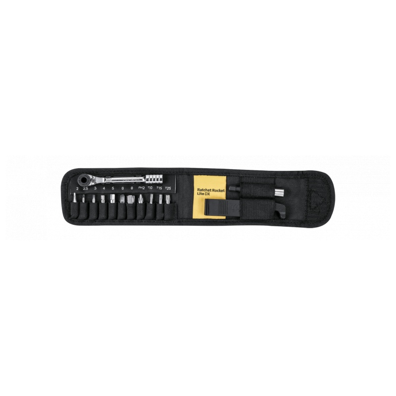 Topeak have made the original Ratchet Rocket smaller and lighter so you have the convince of the ratchet in a smaller package. The Ratchet Rocket Lite DX features a fine tooth ratchet mechanism with reverse lever and thumb wheel for quick rotation and control in tight spots. All this repair capacity fits into a tiny nylon case.