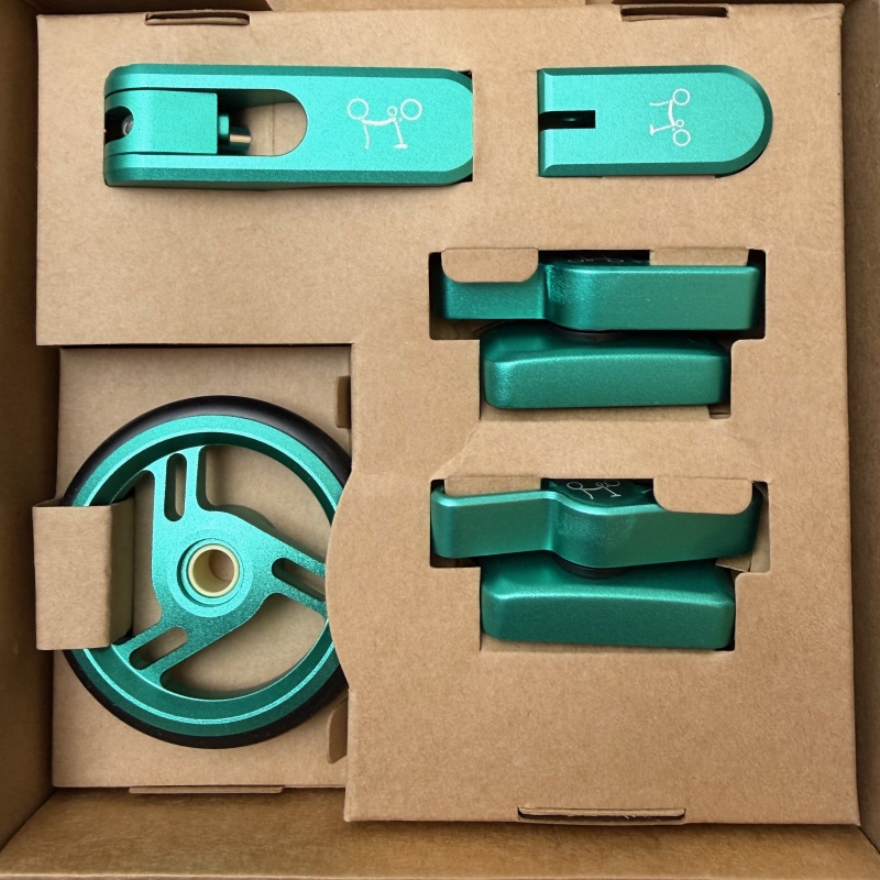 Brompton T Line Colour Touch points - Green including anti-rotation hinge Clamp lever and plate, Rear Frame Clip, Seat post quick release and 2 roller wheels