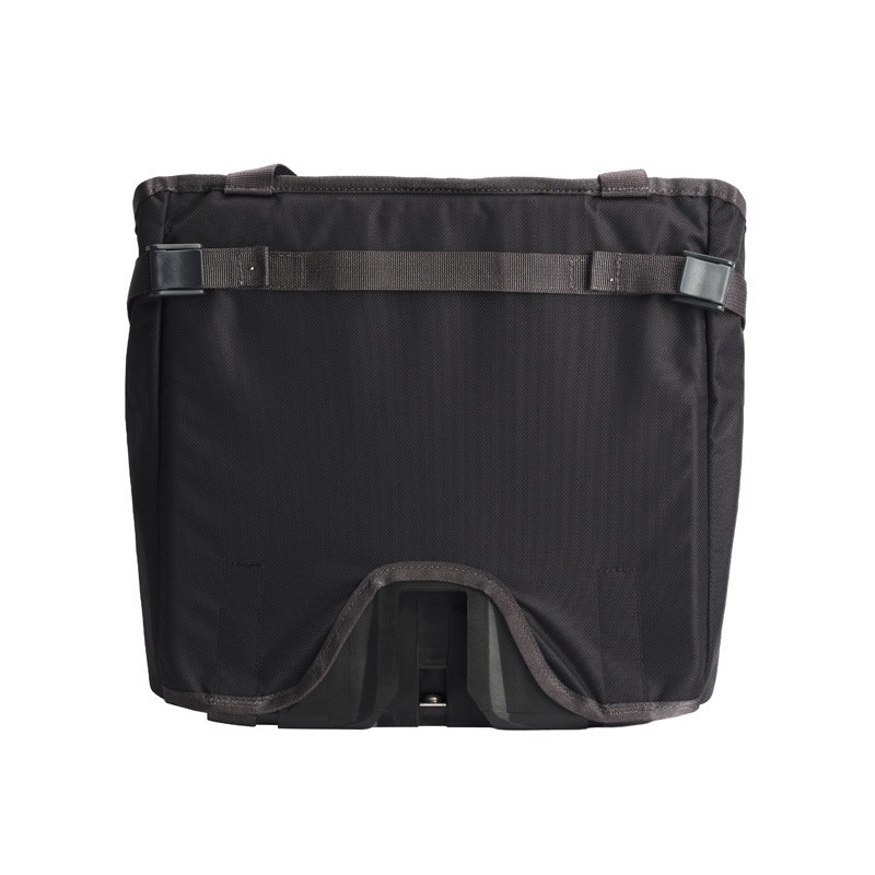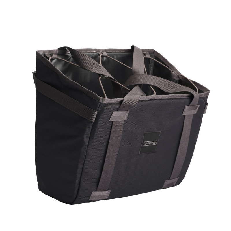 The small Brompton Borough basket has an open top container, ideal for popping down to the shops for supplies - it has webbing loops on the outside for attaching even more stuff, it has cam's on the bag, so that you can draw it slightly more closed and bungee cords to keep your stuff in the bag