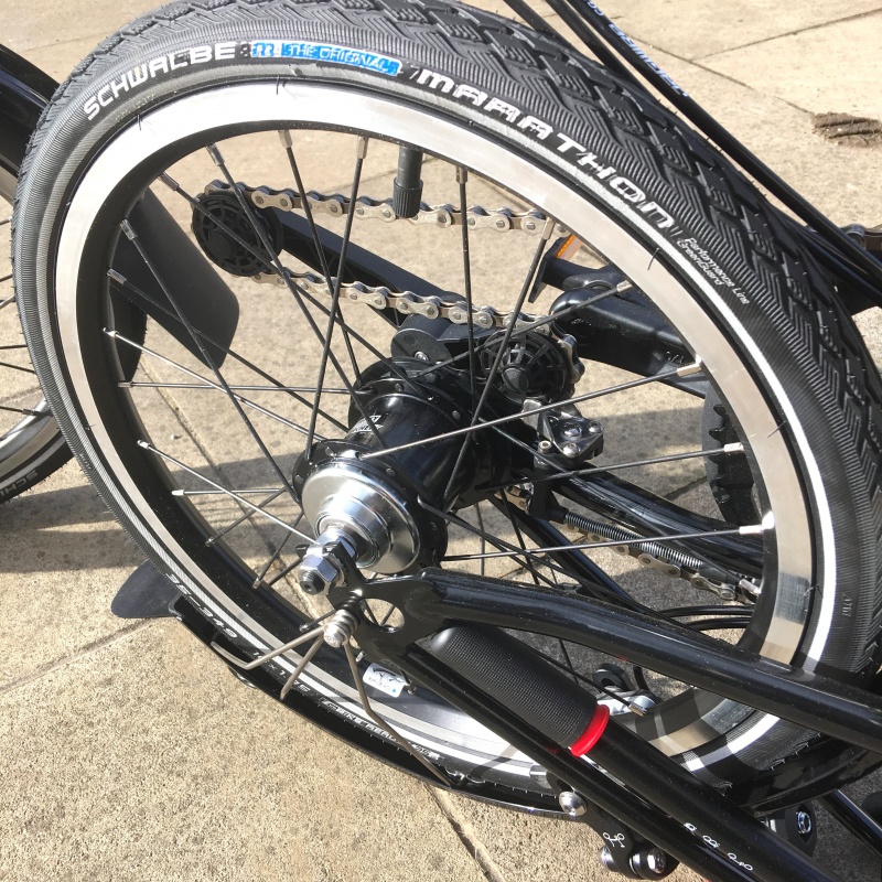 Free upgrade to Schwalbe Marathon 16 x 1.35 inch tyres with reflective sidewall to help make you more visible to cars when riding in the dark