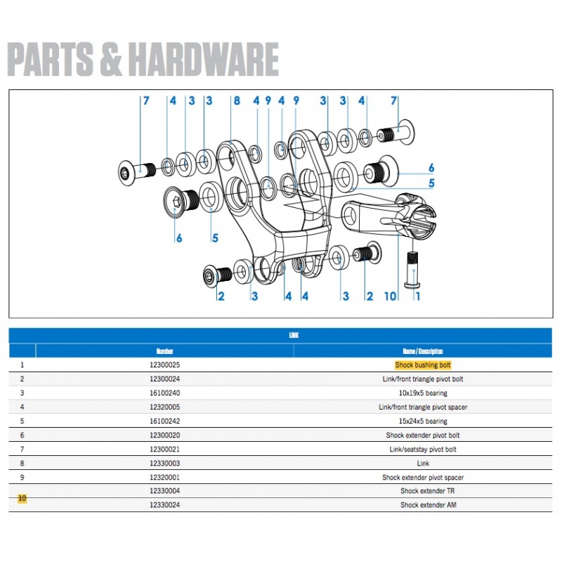 These are part numbers 1 and 10 in the exploded diagram, there is also a picture of the parts on the bike. The shock extender for the Orbea Occam AM is shiny in finish, this part is for the TR and has a matt finish.