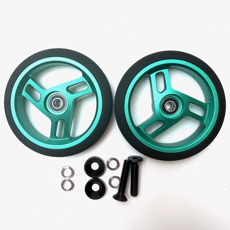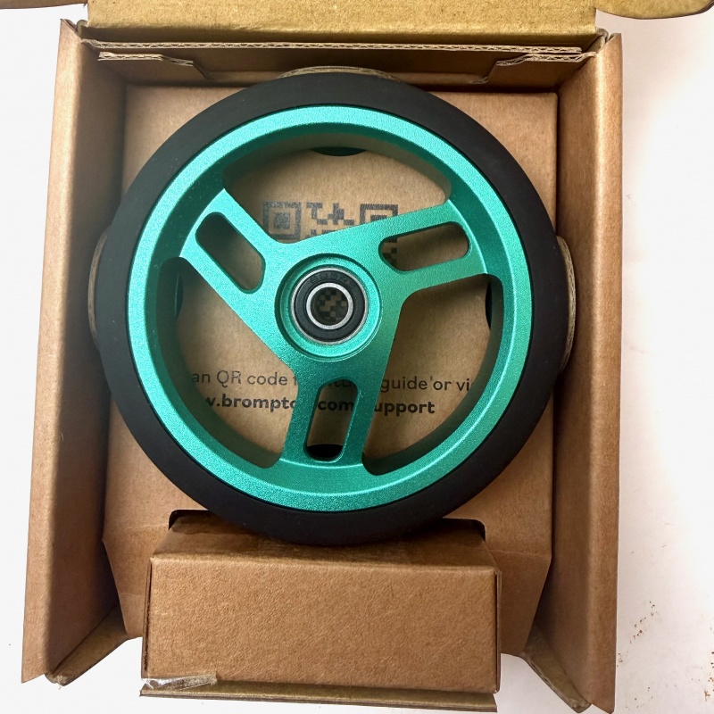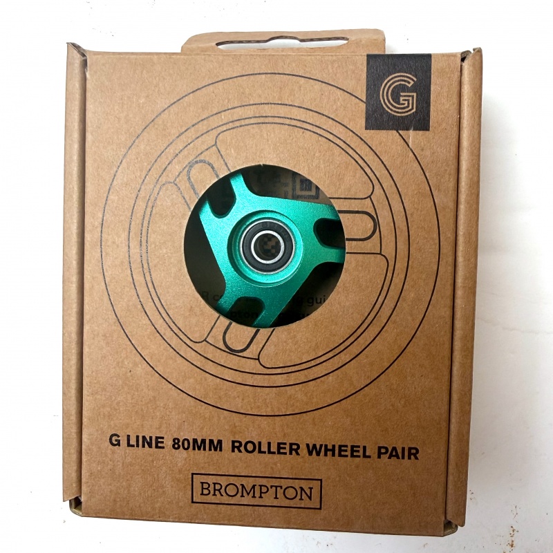 This is a anodised aluminium pair of Brompton G Line Roller Wheels - 80mm as used on the rear of the G Line roller rack in green